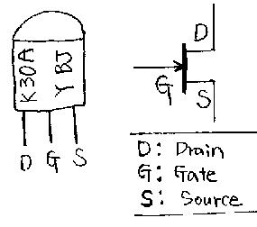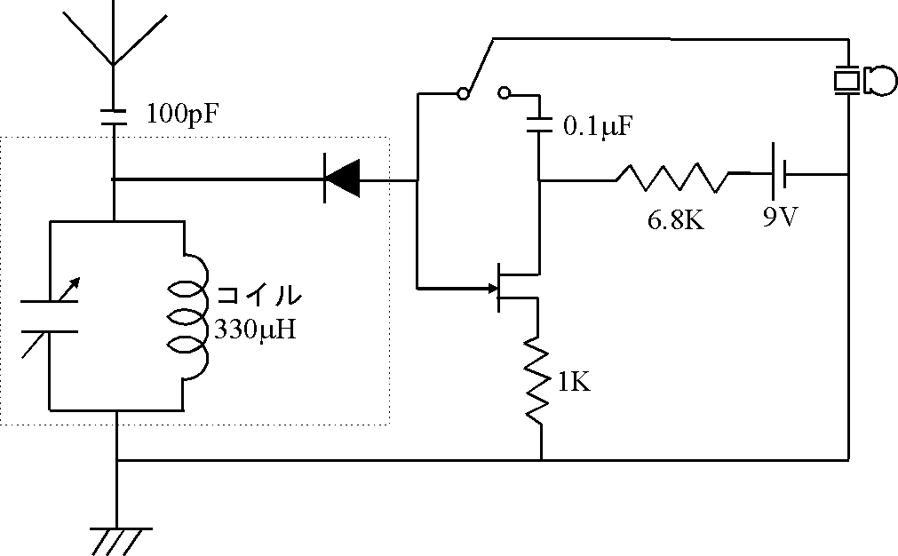 2のうち点線で囲った部分にあたる.コンデンサとコイルの共振回路で特定の周波数を選び出し,ダイオードの整流作用を使って音声信号を取り出す.コイルのインダクタンスは330?Hで,コンデンサには容量可変のポリバリコン(290pF)を用いて共振周波数を変えられるようにする.ダイオードにはゲルマニウムダイオード(IN60)を用いる.基本的にはコイルとコンデンサとダイオードというたった3つの部品でも,アンテナさえしっかりしていれば,電源がなくてもAMラジオを聴くことができる.本実習では,感度を向上させることと増幅回路の学習を兼ねて,低周波の信号をFETで増幅する回路も作製する.使用するFETは