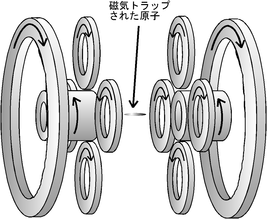@の段階で、原子集団の位相空間密度ρps= n (λdb) 3 ( n は数密度、λdb ≡h/(2πmkBT)1/2は熱的ドブロイ波長)は約10-6で、ボース凝縮の条件(ρps= 2.612)からは程遠い。そこで、後に説明する蒸発冷却と呼ばれる技術を用いるのだが、その準備として、下段MOTの原子を、磁場のみでトラップする。これは原子が持っている磁気モーメントμと磁場Bとの相互作用U= -μ・Bを利用する。原子の適当なスピン状態は、磁場が大きくなればなる程、この相互作用のためエネルギーが上がる(ゼーマンシフト)。よって、このようなスピン状態の原子にとっては、磁場の極小点がポテンシャルの極小点となり、原子はこの点を中心にトラップされる。磁場の極小点を作るために我々が用いたコイルを図4に示す。これはクローバーリーフコイル [8] と呼ばれ、軸対象な調和ポテンシャルを生成する。下段MOTを瞬間的(〜20μs)に切り、クローバーリーフコイルを瞬間的(〜2ms)に立ち上げることにより、原子を磁気トラップへ移行することができる。移行の効率は約30%で、これはトラップできるスピン状態の割合で決まっている。トラップされた原子は、図4に描かれているように葉巻のような形をしている。