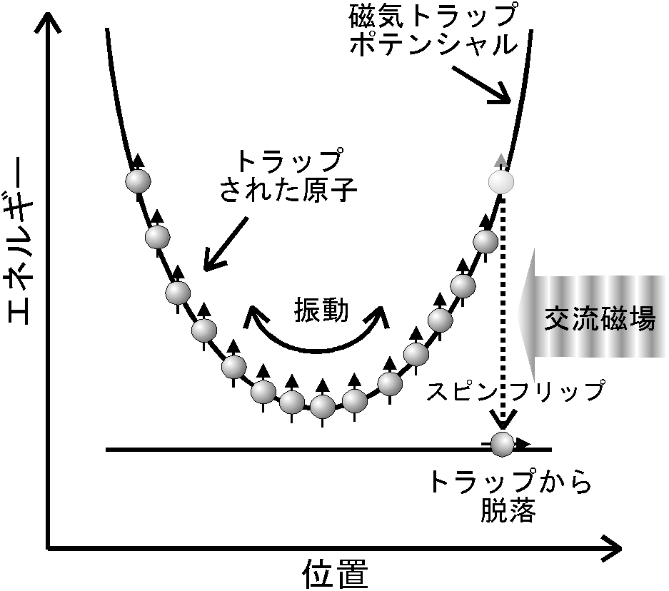図5に蒸発冷却の原理を示す。磁気トラップされるスピン状態の原子は、ゼーマンシフトにより調和型のポテンシャルを感じるが、トラップされないスピン状態の原子は、また違ったポテンシャルを感じる。例えば磁気量子数ゼロのスピン状態は、ゼーマンシフトしないので、ポテンシャルカーブはフラットである。図5には、そのような二つ−トラップされるスピン状態とされないスピン状態−のポテンシャルカーブが描かれている。磁気トラップされている原子は調和ポテンシャルの中で熱分布(正確にはボース分布だが、近似的にボルツマン分布)していて、運動エネルギーの大きい原子ほど、ポテンシャルの高い所、つまり中心から離れた所まで振動する。そのような地点における、二つのポテンシャルカーブのエネルギー差、つまりゼーマンシフト量に相当する周波数の交流磁場を磁気トラップされた原子集団に照射すると、原子のスピンはフリップし、トラップされないポテンシャルカーブに乗り移り、トラップから脱落する。このように運動エネルギーの大きい原子だけを選択的にトラップから取り除くことができる。そして、残った原子集団内でエネルギーの再分配(熱化)が起こると、その集団の温度は以前より下がる。これが蒸発冷却の原理である。我々は磁気トラップに照射する交流磁場の周波数を35MHzから、原子を完全に削り取る直前の0.6MHz付近まで、65秒かけて連続的に掃引した。
