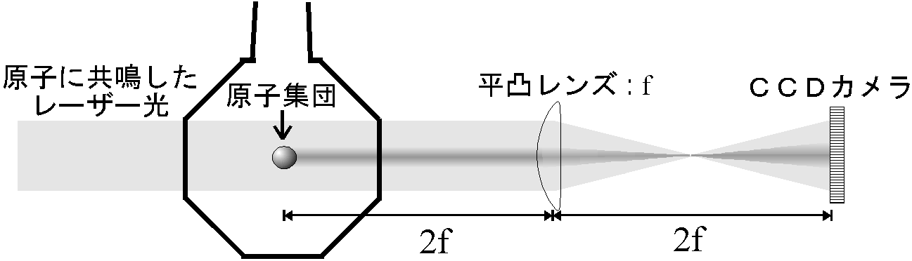 蒸発冷却終了後、磁気トラップコイルの電流を瞬間的に切り、原子集団をトラップから開放する。その後、原子集団は初期の速度分布に従って拡散しながら、重力によって落下する。ある程度の時間が経てば、原子集団の空間分布は、初期の速度分布を反映した形になる。この空間分布を観察するため、図6のような吸収イメージング法を用いる。観察したい時刻に、原子の光学遷移に共鳴したレーザー光を、パルス的に原子集団に照射する。原子集団によって吸収されたレーザー光の影は、レンズによってCCDカメラ上に結像され、撮影される。こうして撮影された画像(TOFイメージ)から原子の個数、速度分布、温度などが見積もられる。