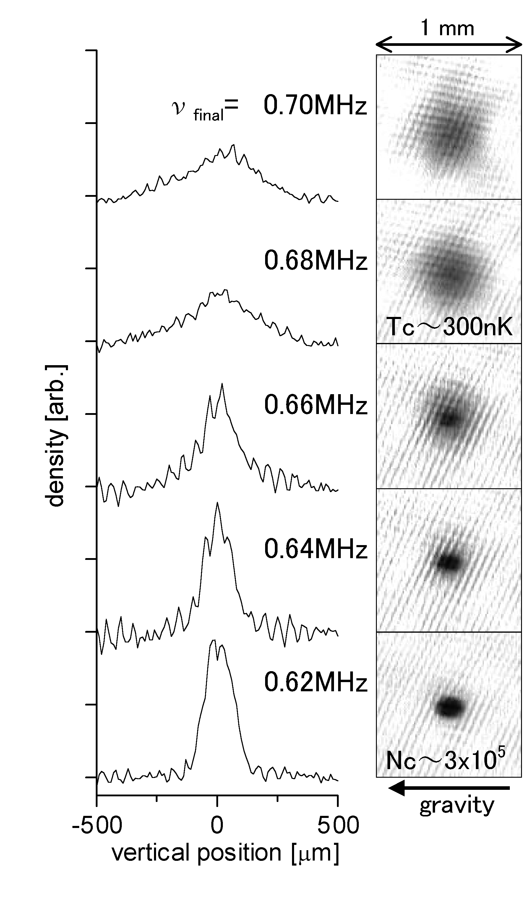 図7は、蒸発冷却における交流磁場の最終掃引周波数を、0.70MHzから0.62MHzまで0.02MHz間隔で変えて実験したときの、一連のTOFイメージである。落下時間は28msで、空間分布は、ほぼ速度分布に対応している。0.68MHzまでは、分布はガウシアン型で、その幅から原子集団は約300nKまで冷却されていることがわかる。0.66MHzにおいてガウシアン分布の中央に、鋭い密度のピークが現れる。ボース凝縮相の出現である。0.62HMzでは、ほとんどすべての原子はボース凝縮相に落ち込んでいる。凝縮相が楕円をしているのは、磁気トラップの形の非等方性によるものであり、ボース凝縮の証拠の一つである。