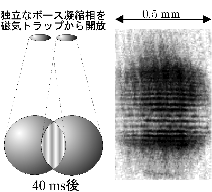 ボース凝縮相が、単なる非常に密度の高い原子集団と違う所は、それがたった一つの波動関数で記述される、という点である。このことを劇的に示したMITグループの実験を、ここで紹介する[9]。彼らは、図8左のように、独立なボース凝縮相を用意し、それらを磁気トラップから開放し、互いにオーバーラップさせた。図8右は、開放から40ms後のTOFイメージである。オーバーラップした部分に干渉縞が現れている。この実験事実から、独立なボース凝縮相間には特定の相対位相が存在し、かつ、その相対位相が凝縮相全体(〜0.5mm)にわたり均一であることがわかる。つまり、拡散したボース凝縮相は、コヒーレント長が0.5 mmの物質波となっている。ちなみに、常温のルビジウム原子のコヒーレント長(熱的ドブロイ波長)は、0.1Aである。
